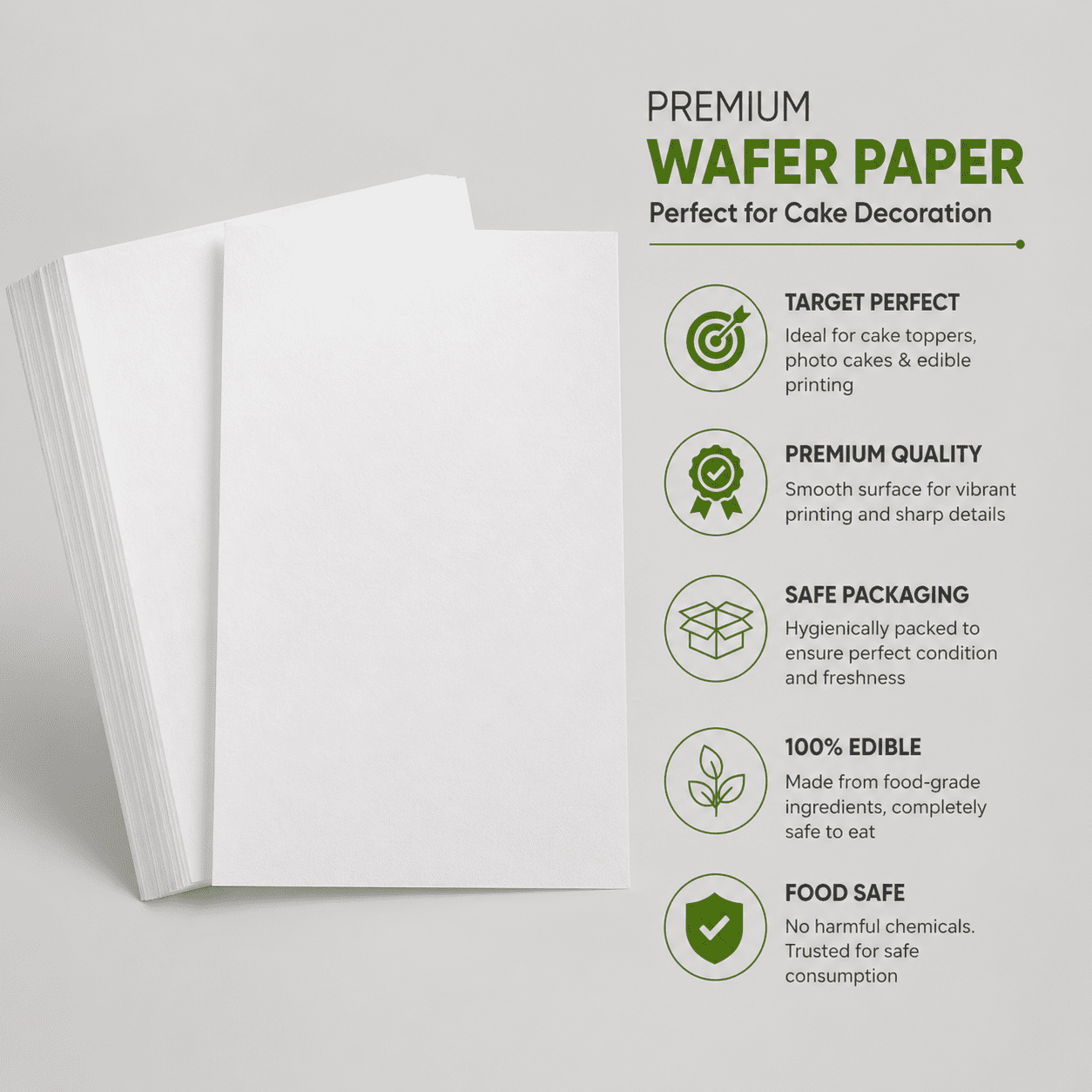 Enhance your cake creations with our premium edible A4 plain wafer paper, specially designed for bakers, cake artists, and professionals. Made from high-quality, food-grade ingredients, this wafer paper is perfect for creating elegant cake decorations, edible prints, toppers, and creative dessert designs.